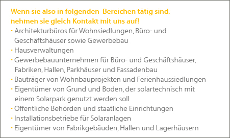 Durch unsere direkten Kontakte zum Management dieser Produzenten sind wir in der Lage ein optimales Preis-Leistungsverhältnis für sie zu verhandeln. Sonderanfertigungen sind für viele unserer Produktpartner eine Herausforderung, der sie sich gerne stellen. Alle Hersteller von Solartechnik, mit denen wir zusammenarbeiten, werden anhand einer von uns festgelegten Qualitätscheckliste geprüft. Dabei spielen neben den Top Qualitätsprodukten auch Serviceleistungen für unsere Kunden, wie z.B. Garantieverlängerungen und Ferndiagnosesysteme eine große Rolle.